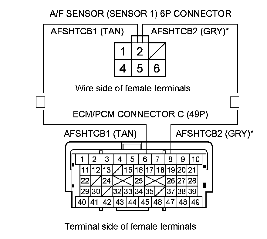Repair open in the wire between the ECM/PCM (C6 (C8)*) and the A/F sensor (Sensor 1), then go to step 26.