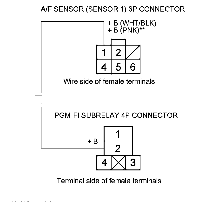 17. Check for continuity between A/F sensor (Sensor 1) 6P connector terminal No. 1 and PGM-FI subrelay 4P connector terminal No. 2.
