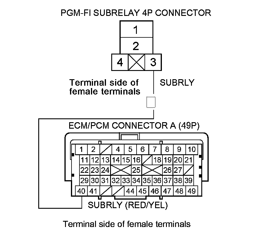 Repair open in the wire between the PGM-FI subrelay, and the ECM/PCM (A40), then go to step 26.