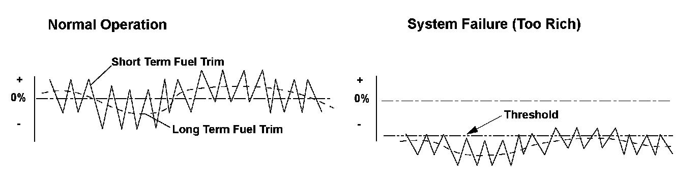 The engine control module (ECM) detects the oxygen content in the exhaust gas from the rear air/fuel ratio (A/F) sensor (bank 1, sensor 1) signal voltage, and it uses fuel feedback control to maintain the optimal air/fuel ratio. The air/fuel ratio coefficient for correcting the amount of injected fuel is the short term fuel trim. The ECM varies short term fuel trim continuously to keep the air/fuel ratio close to the stoichiometric ratio for all driving conditions. Long term fuel trim is computed from short term fuel trim and is used to regulate long term deviation from the stoichiometric air/fuel ratio, which occurs when fuel metering components deteriorate with age or system failures occur. In addition, long term fuel trim is stored in the ECM memory and is used to determine when fuel metering components malfunction. When long term fuel trim is higher than normal, which is about 1.0 (0 %), the amount of injected fuel must be increased, and when lower than normal, it must be decreased. If long term fuel trim is lower than normal (too rich), a malfunction in the fuel metering components is detected and a DTC is stored.