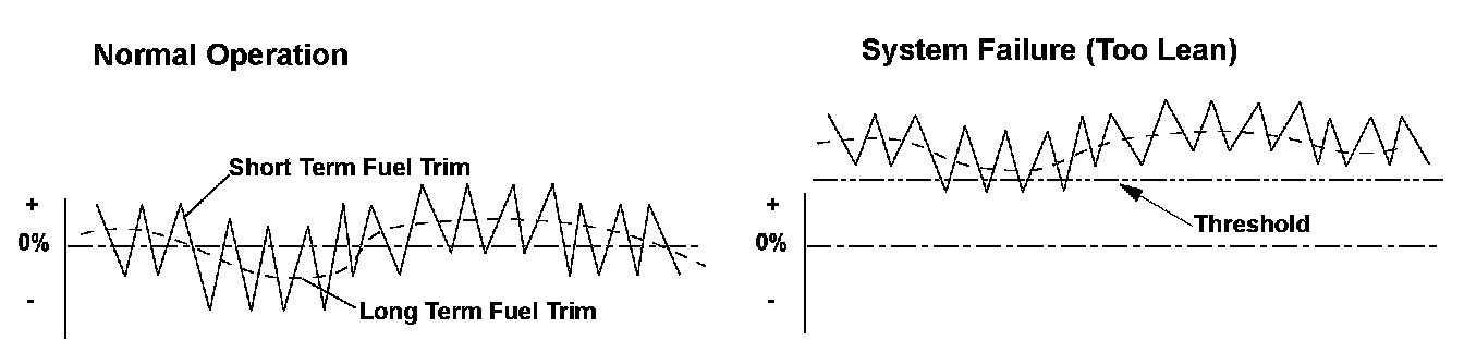 The powertrain control module (PCM) detects the oxygen content in the exhaust gas from the front air/fuel ratio (A/F) sensor (bank 2, sensor 1) signal voltage, and it uses fuel feedback control to maintain the optimal air/fuel ratio. The air/fuel ratio coefficient for correcting the amount of injected fuel is the short term fuel trim. The PCM varies short term fuel trim continuously to keep the air/fuel ratio close to the stoichiometric ratio for all driving conditions. Long term fuel trim is computed from short term fuel trim and is used to regulate long term deviation from the stoichiometric air/fuel ratio, which occurs when fuel metering components deteriorate with age or system failures occur. In addition, long term fuel trim is stored in the PCM memory and is used to determine when fuel metering components malfunction. When long term fuel trim is higher than normal, which is about 1.0 (0 %), the amount of injected fuel must be increased, and when lower than normal, it must be decreased. If long term fuel trim is higher than normal (too lean), a malfunction in the fuel metering components is detected and a DTC is stored.