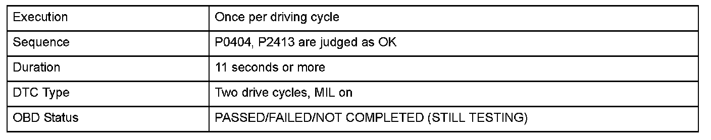 The exhaust gas recirculation (EGR) deterioration failure conditions include a sticking lift sensor, restricted passages, and leakage from the external piping. At any specific EGR lift value there is a corresponding A/F compensation value. If the A/F compensation value is greater than the corresponding EGR lift value, the engine control module (ECM) detects a malfunction and stores a DTC.