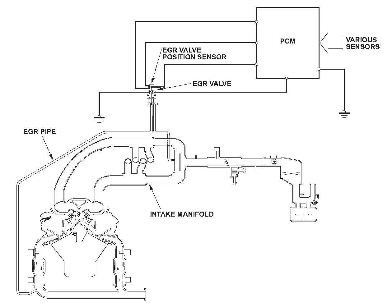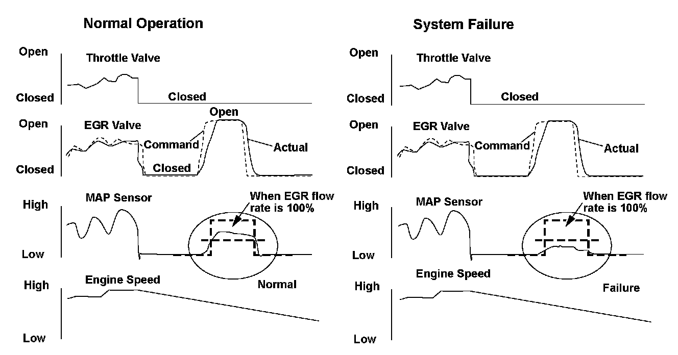 The exhaust gas recirculation (EGR) valve, which is controlled by the engine control module (ECM), is opened and the exhaust gas flows through the EGR valve and the intake manifold and the EGR passage. the exhaust gas is circulated into the air/fuel mixture to lower combustion temperatures, thus reducing oxides of nitrogen (NOx) emissions. The EGR flow is inspected as follows. The EGR valve is closed during deceleration with the throttle valve fully closed. Then the ECM fully opens the EGR valve. After set time, the ECM computes the ratio of the present EGR flow to the normal EGR flow by monitoring the fluctuation of the intake manifold pressure between when the EGR valve is fully opened and when it is fully closed. If the EGR flow rate is lower than normal, the ECM detects a malfunction and stores a DTC.