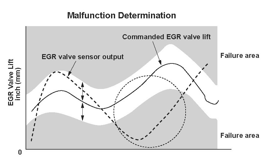 The exhaust gas recirculation (EGR) valve, which is controlled by the engine control module (ECM), is opened and the exhaust gas flows through the EGR valve, the intake manifold, and the EGR passage. The exhaust gas is circulated into the air/fuel mixture and the mixture is drawn into the combustion chamber to lower combustion temperatures, thus reducing oxides of nitrogen (NOx) emissions. A sensor (lift sensor) is built into the EGR valve and detects the amount of valve lift. The command value for the target valve lift is stored in the ECM so that exhaust gas recirculation can be optimized according to driving conditions. Comparing this command value with the lift sensor output signal value, the ECM controls the EGR valve to make the amount of actual valve lift equal to the command value. If the difference between the value of commanded EGR valve lift and actual EGR valve lift is a specified value or more, an abnormality in the EGR valve or the lift sensor output is determined, the ECM detects a malfunction and stores a DTC.