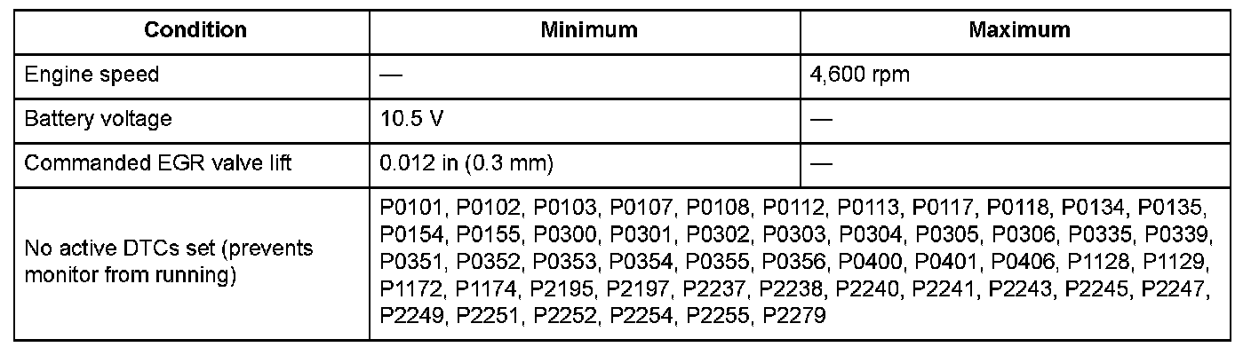The difference between the command value of the amount of EGR valve lift in the ECM and the actual amount of valve lift is 0.041 in (1.02 mm) or more for at least 5.0 seconds.