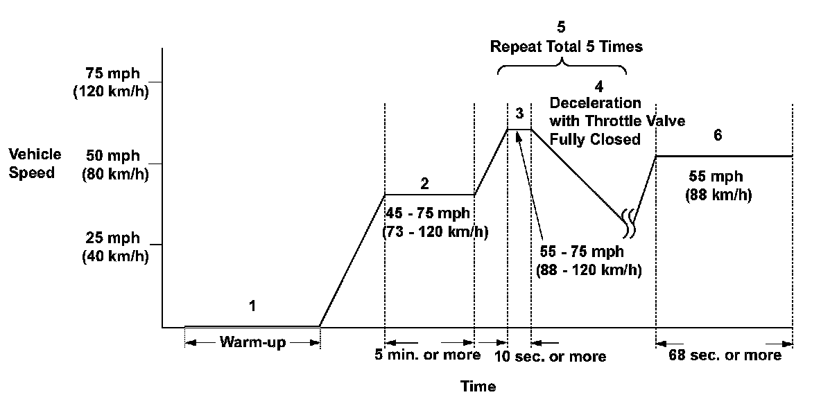 2. Drive the vehicle at a speed between 45 - 75 mph (73 - 120 km/h) for at least 5 minutes, to warm up the TWC.