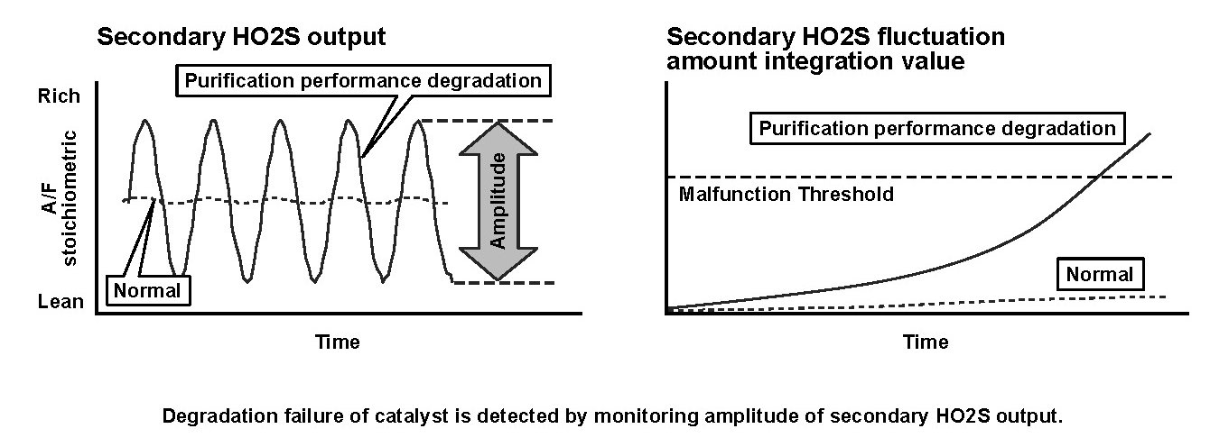 The three way catalytic converter (TWC) converts hydrocarbons (HC), carbon monoxide (CO), and oxides of nitrogen (NOx) in the exhaust gas to water vapor, carbon dioxide (CO2), and dinitrogen (N2). The engine control module (ECM) fluctuates the air/fuel ratio (A/F) temporarily to detect the purification performance of the TWC and measures the degree of fluctuation in the secondary HO2S output. If the accumulated value for a set time is too great, deterioration of the performance of the catalyst is detected.