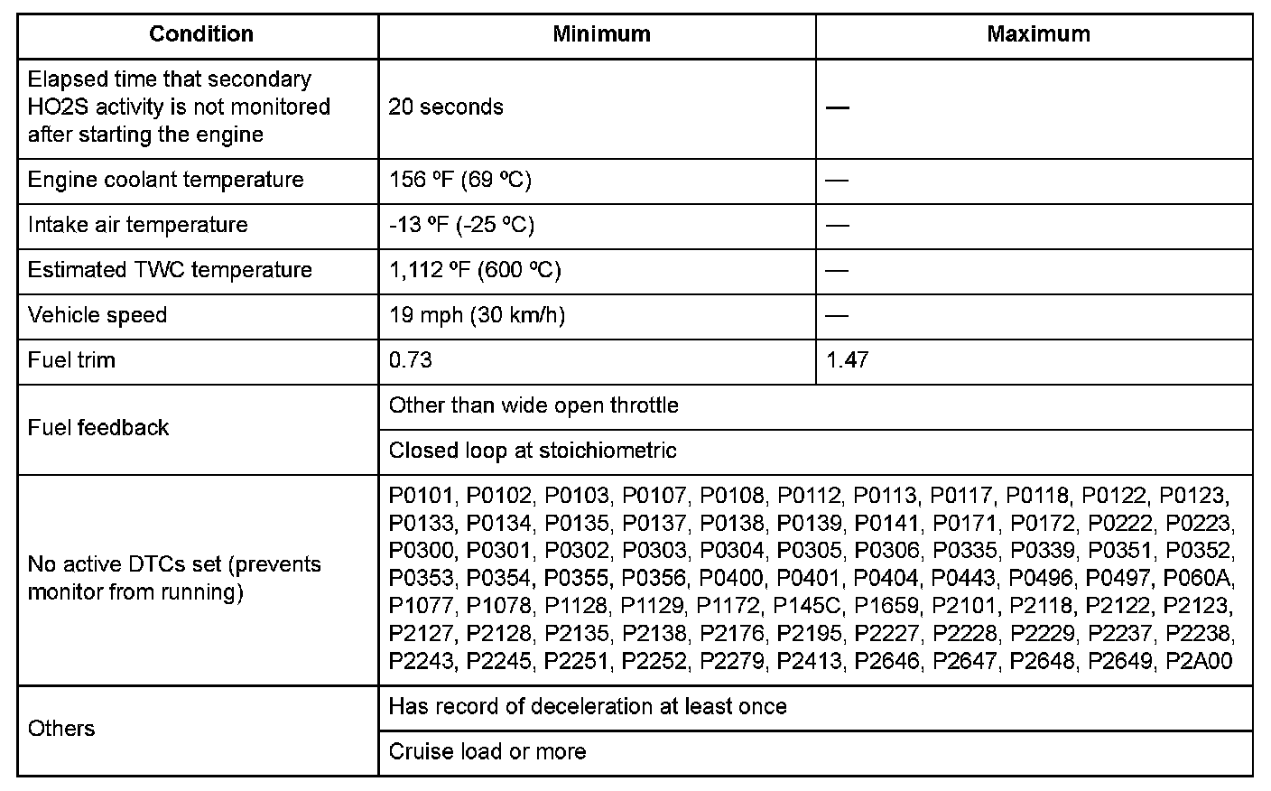 The secondary HO2S fluctuation integration value is 3.0 V or more for at least 7.5 seconds.