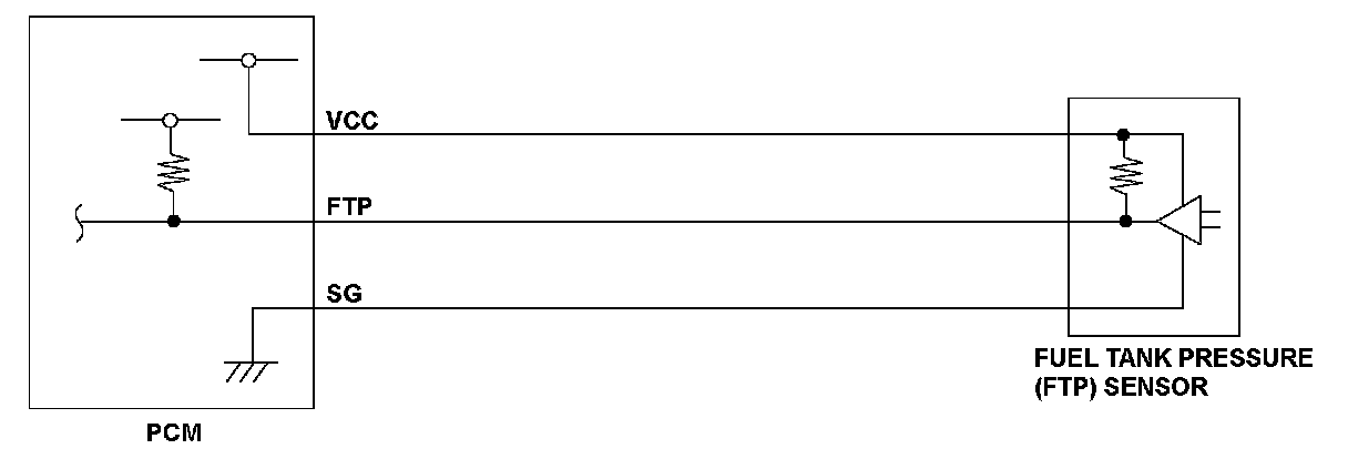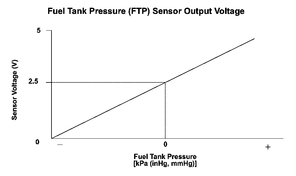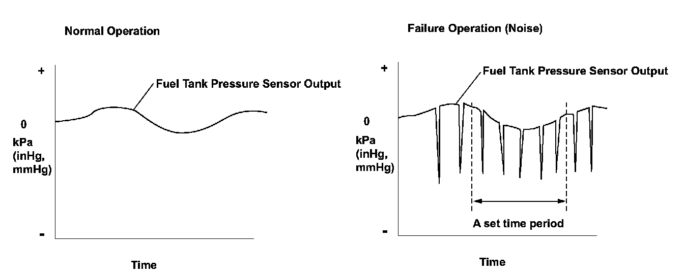The fuel tank pressure (FTP) sensor is installed on the evaporative emission (EVAP) canister. The FTP sensor is used to detect leaks in the EVAP system. The powertrain control module (PCM) monitors the FTP sensor output voltage. The FTP sensor output voltage rises as the fuel tank pressure increases. Conversely, the FTP sensor output voltage drops as the fuel tank pressure decreases. Rapid changes in the FTP sensor output voltage due to electrical noise or an intermittent open during the EVAP leak detection may cause incorrect leak detection, so abnormal output is monitored. If the FTP sensor output voltage change occurs for specified ratio within a set time, the PCM detects a malfunction and stores a DTC.