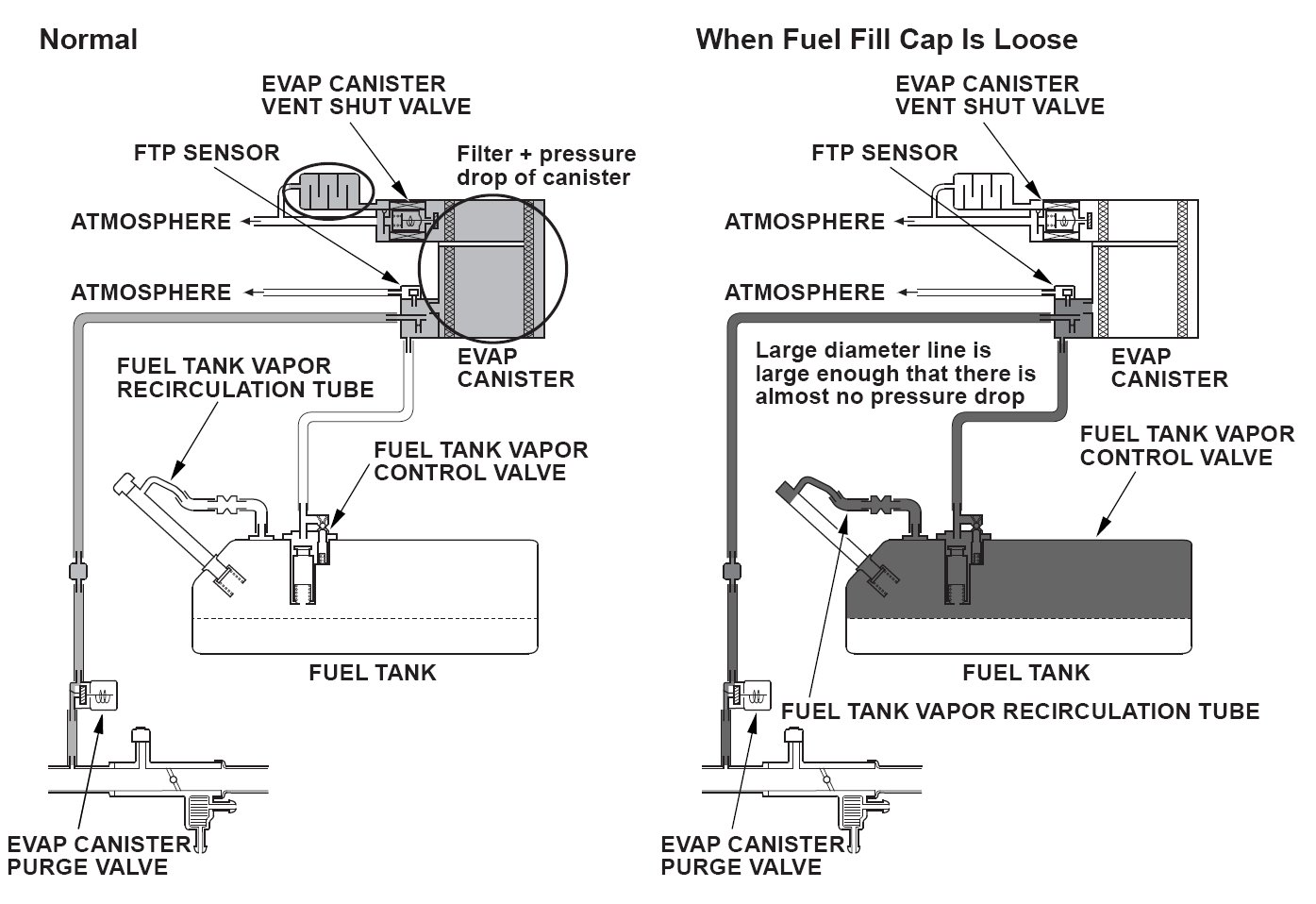 When the fuel fill cap is installed properly, purge flow occurs due to the airflow resistance of the canister, and tank pressure will be reduced. When the fuel fill cap is loosened, the fuel tank pressure will not decrease even when the airflow resistance decreases and purge flow occurs, because air is being vented from the tank to the atmosphere. By checking the fuel tank pressure with various purge flows, and using the above characteristics, a loose fuel fill cap is detected. The engine control module (ECM)/powertrain control module (PCM) calculates the relationship of the purge flow and fuel tank pressure (FTP) sensor, and when the slope of the decreasing fuel tank pressure to the purge flow increase is small, a loose fuel fill cap is detected. The failure detection is normally done during purge.