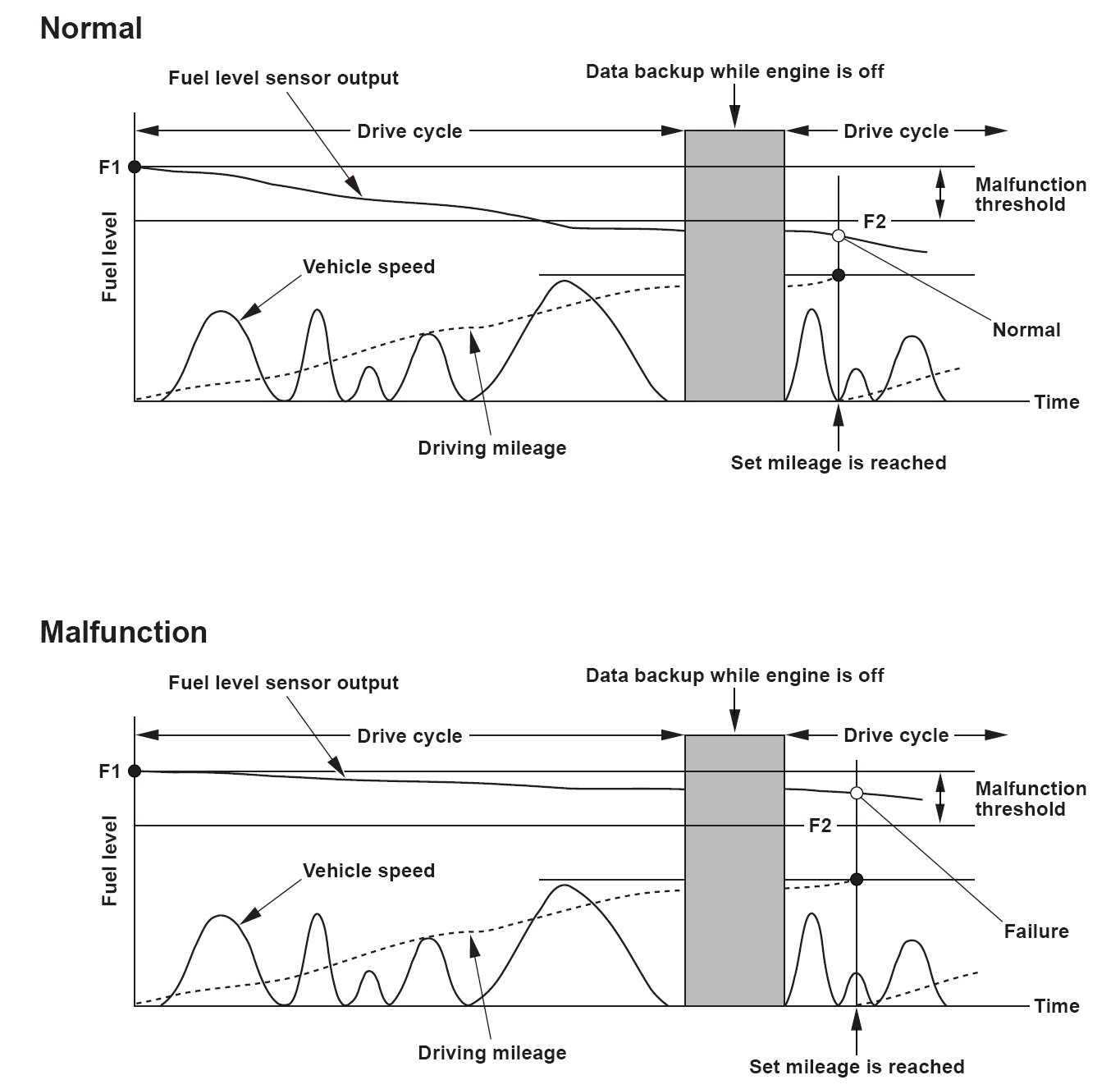 The fuel level sensor is incorporated with the fuel pump and installed in the fuel tank. Using a built-in potentiometer and float, it converts the movement of the float into electrical signals that correspond to the fuel level, and it indicates the amount of fuel in the fuel tank. If the engine control module (ECM)/powertrain control module (PCM) receives no change in the fuel level sensor output after driving for a specified number of miles, it detects a malfunction and stores a DTC.