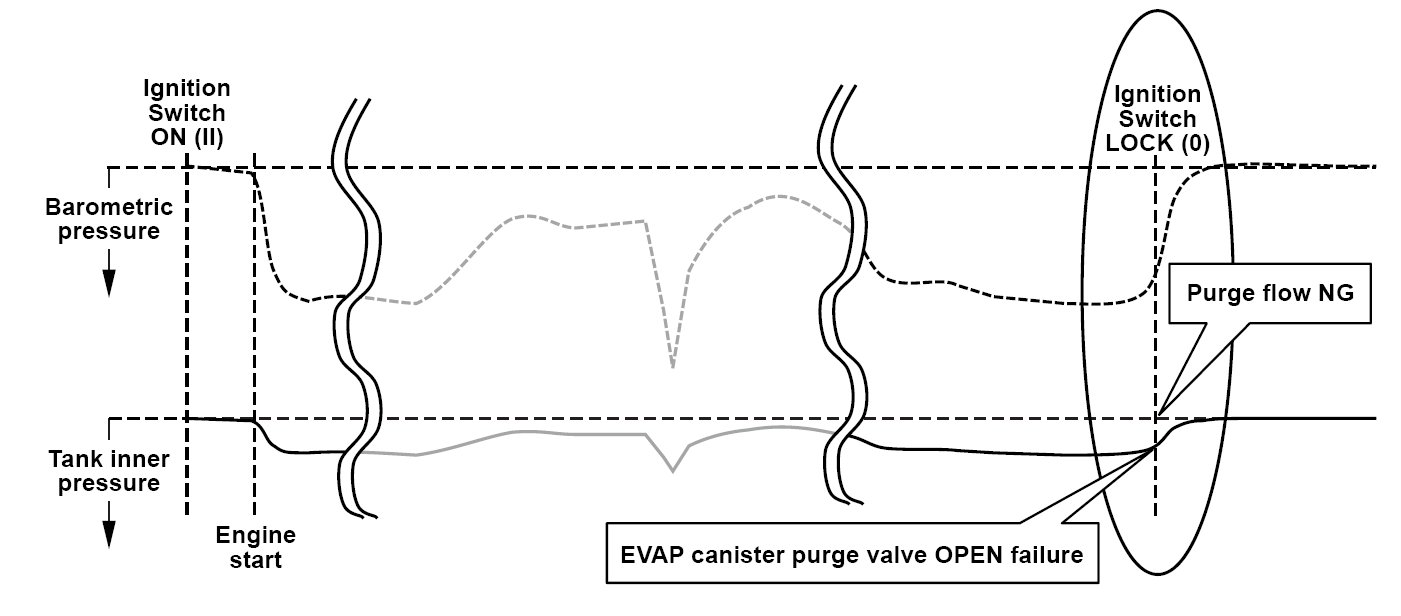 The EVAP canister purge valve opens normally (EVAP canister purge valve OPEN OK) and detects that the purge flow is normal when the pulse of the EVAP canister purge valve duty cycle is transmitted to the fuel tank pressure (FTP) sensor during purge flow (pulse method).