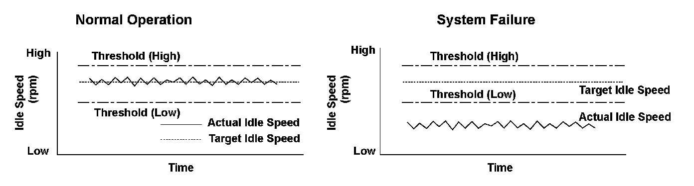 A target idle speed that meets the engine operating conditions (coolant temperature, A/C ON or OFF, etc.) is stored in the engine control module (ECM). The ECM monitors and controls the idle speed so that the actual idle speed is equal to the target idle speed. If the actual idle speed varies beyond a specified value from the target speed over a certain period of time, the ECM detects a malfunction in the idle speed control system and stores a DTC.
