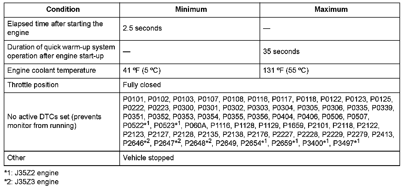 When a malfunction is detected during the first drive cycle with the ECT and IAT at engine start-up within the specified temperature range, a Pending DTC is stored in the ECM/PCM memory. If the malfunction returns in the next (second) drive cycle with the ECT and IAT at engine start-up within the specified temperature range, the MIL comes on and a Confirmed DTC and the freeze data are stored.