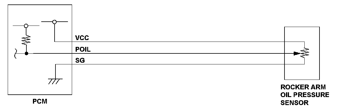 The rocker arm oil pressure sensor detects the engine oil pressure in the variable cylinder management (VCM) system. When the voltage from the rocker arm oil pressure sensor is a set value for a specified time, the powertrain control module (PCM) detects a malfunction and stores a DTC.