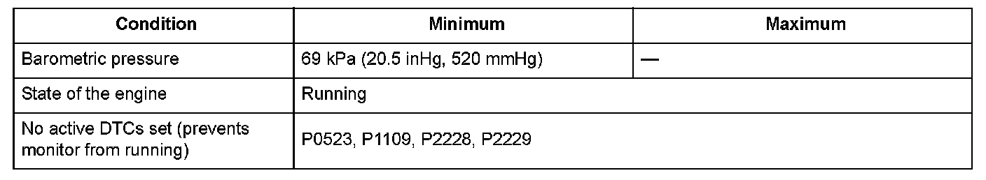 The barometric pressure (BARO) sensor is 69 kPa (20.5 inHg, 520 mmHg) or more and the rocker arm oil pressure sensor voltage is 0.18 V or less for at least 2 seconds.