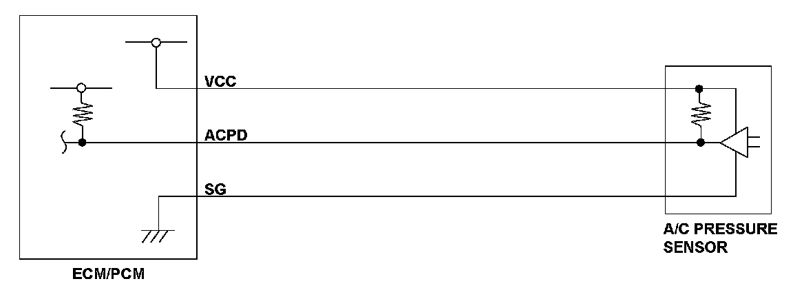 The A/C pressure sensor measures the pressure change of the air conditioning refrigerant. The signal from the A/C pressure sensor is low voltage at low pressure (when the air conditioning load is low) and high voltage at high pressure (when the air conditioning load is high). The engine control module (ECM)/powertrain control module (PCM) compares the expected voltage to the A/C pressure sensor output voltage. When the A/C pressure sensor output voltage is lower than the expected voltage for a set time, the ECM/PCM detects a malfunction and stores a DTC.