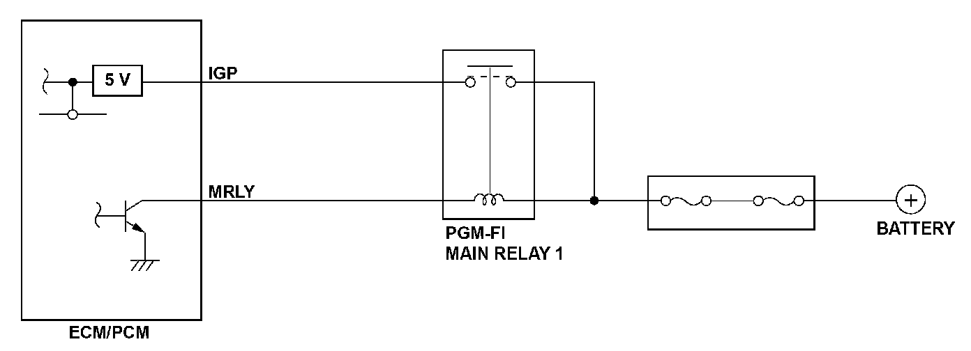 If there is a short to ground in the harness between the engine control module (ECM)/powertrain control module (PCM) and PGM-FI main relay 1, PGM-FI main relay 1 stays ON even if the ignition switch is turned to LOCK (0), and the ECM/PCM remains active. However, the engine is not running because power for the gauges, the ignition, and the fuel pump is turned OFF by the ignition switch. When the ECM/PCM operates for a set time after the ignition switch is turned to LOCK (0), a malfunction is detected and a DTC is stored.