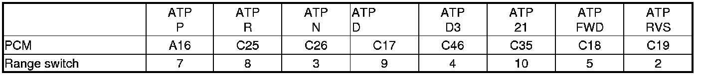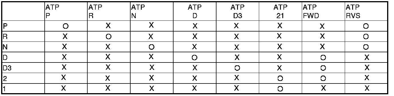 3. Compare the ATPP, ATPR, ATPN, ATPD, ATPD3, ATP21, ATPFWD, and ATPRVS inputs with the HDS to the following table, in each shift lever position.