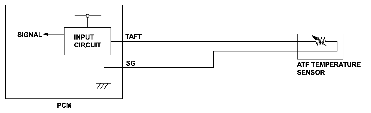 The ATF temperature sensor is a thermistor type sensor that changes resistance according to the change in ATF temperature. The powertrain control module (PCM) sends a 5 V reference voltage to the sensor through a pull-up resistor. When the ATF temperature is low, the sensor resistance increases and the PCM detects a high signal voltage. As the ATF temperature rises, the sensor resistance decreases and the PCM detects a low signal voltage. When the ATF temperature sensor signal voltage to the PCM is under the specification, indicating that the temperature is above the specification (a short to ground), a malfunction is detected and stores a DTC.