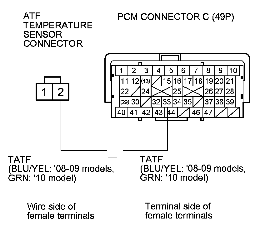 10. Check for continuity between PCM connector terminal C33 and ATF temperature sensor connector terminal No. 2.