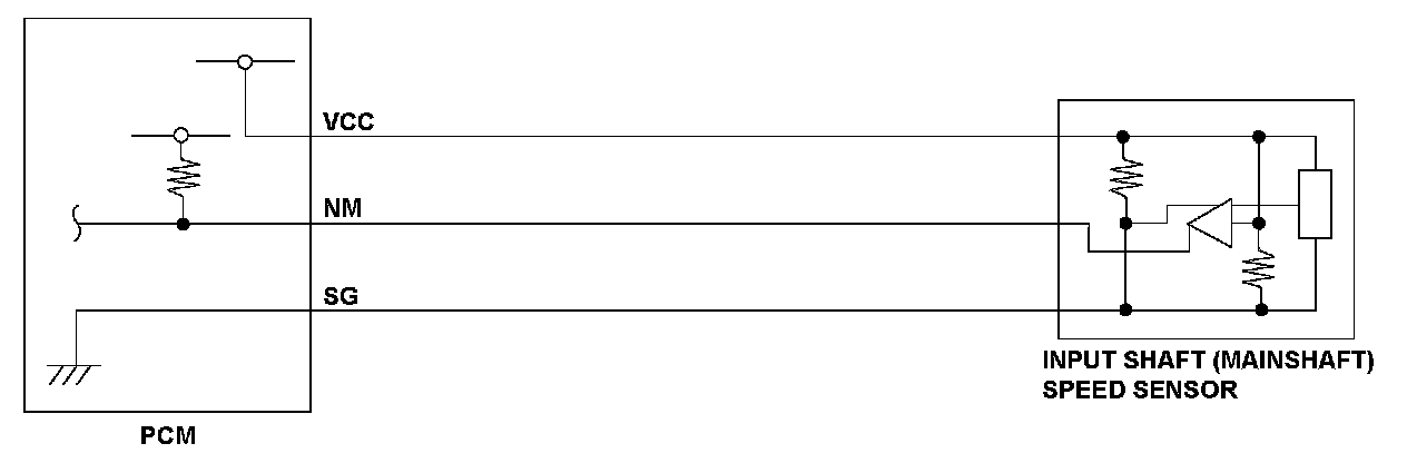 The input shaft (mainshaft) speed sensor is attached to the outside of the transmission housing. The input shaft (mainshaft) speed sensor generates a pulsing signal according to the speed of the idler gear on the input shaft (mainshaft). Using that signal, the powertrain control module (PCM) determines the speed of the input shaft (mainshaft). If no pulses occur with the input shaft (mainshaft) rotating, the PCM detects a malfunction that may be caused by an open, a temporary open, or a short to ground. Based on the fluctuation of the vehicle speed measured by the input shaft (mainshaft) speed sensor, a malfunction is detected and a DTC is stored.