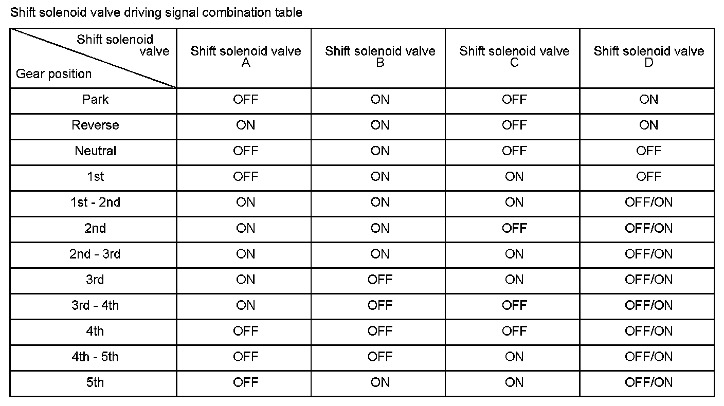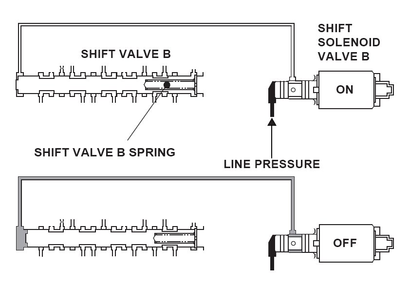 Shift solenoid valve B is installed in the transmission housing. It is controlled by the ON/OFF signal from the powertrain control module (PCM) to apply modulated pressure to shift valve B. The signal from the PCM is output to apply clutch pressure control pressure to the proper gear clutch according to the gear change schedule. When the signal to shift solenoid valve B from the PCM is ON, and modulated pressure is discharged, shift valve B is inactive. When the signal to shift solenoid valve B from the PCM is OFF, and modulated pressure is applied to shift valve B, it operates against the shift valve B spring. The PCM monitors the input shaft (mainshaft) speed and the output shaft (countershaft) speed at the gear change determined by the shift schedule. When an improper gear ratio is output compared to the predetermined gear change mode, the PCM detects a shift solenoid valve B OFF failure and stores a DTC.