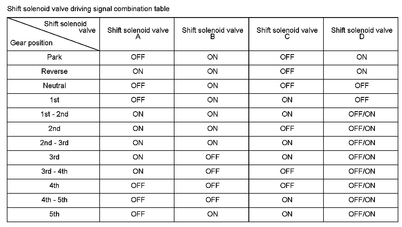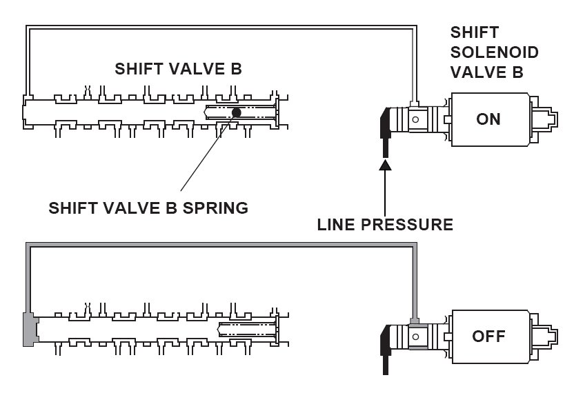 Shift solenoid valve B is installed in the transmission housing. It is controlled by the ON/OFF signal from the powertrain control module (PCM) to apply modulated pressure to shift valve B. The signal from the PCM is output to apply clutch pressure control pressure to the proper gear clutch according to the gear change schedule. When the signal to shift solenoid valve B from the PCM is ON, and modulated pressure is discharged, shift valve B is inactive. When the signal to shift solenoid valve B from the PCM is OFF, and modulated pressure is applied to shift valve B, it operates against the shift valve B spring. The PCM monitors the input shaft (mainshaft) speed and the output shaft (countershaft) speed at the gear change determined by the shift schedule. When an improper gear ratio is output compared to the predetermined gear change mode, the PCM detects a shift solenoid valve B ON failure and stores a DTC.