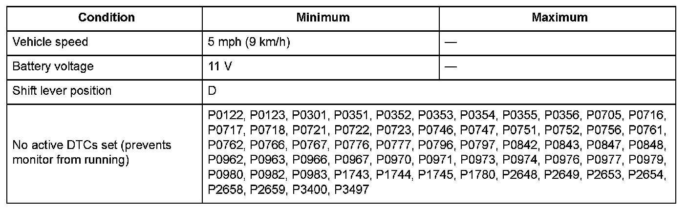 - Transmission fluid pressure switch A (2nd clutch) is ON against the 3rd --> 4th gear upshift command for at least 11 seconds.