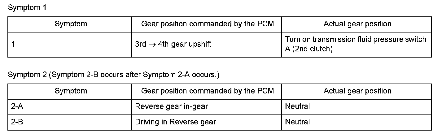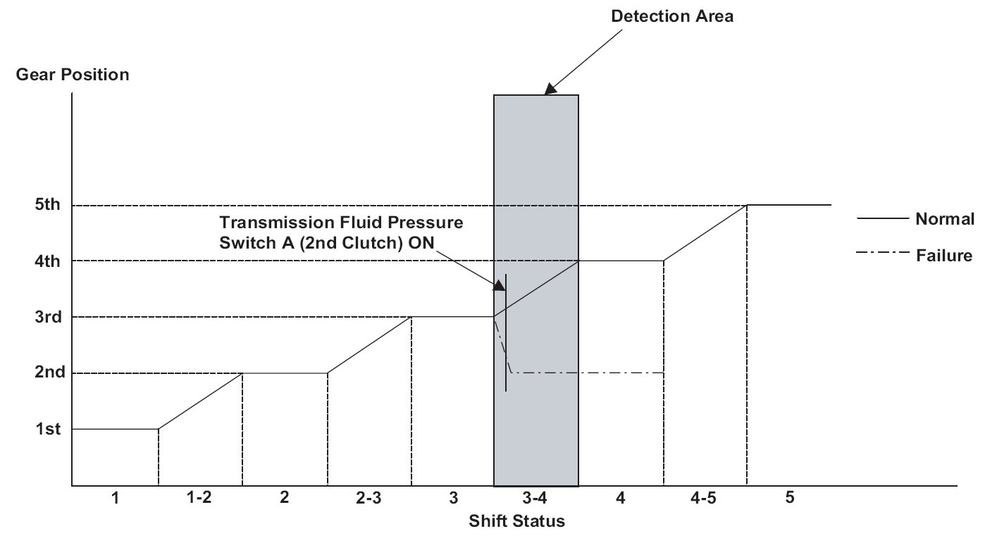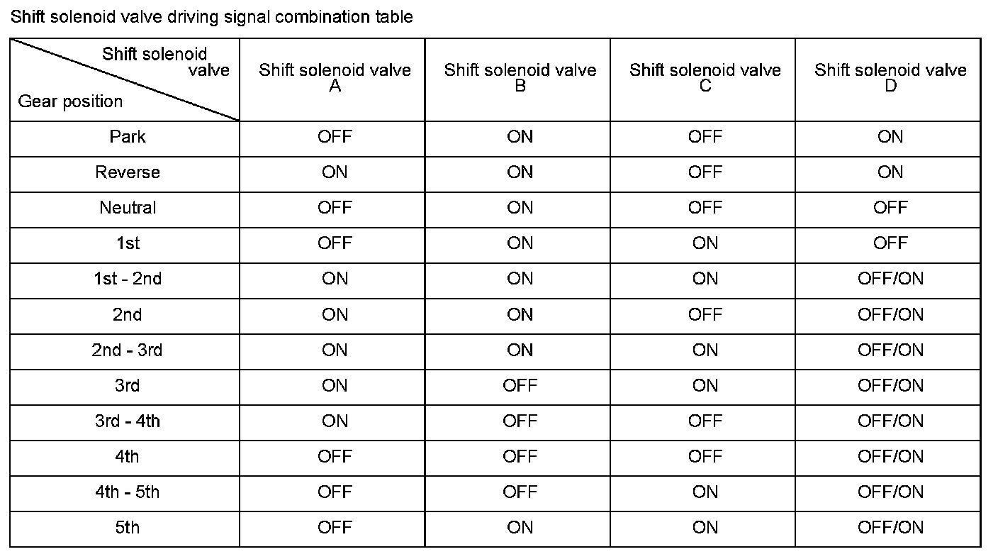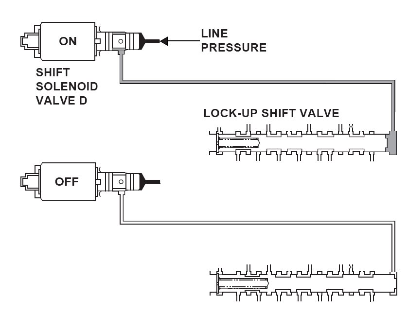 Shift solenoid valve D is installed in the transmission housing. It is controlled by the ON/OFF signal from the powertrain control module (PCM) to apply modulated pressure to the lock-up shift valve. The signal from the PCM is output to apply clutch pressure control pressure to the proper gear clutch according to the gear change schedule. When the signal to shift solenoid valve D from the PCM is ON, and modulated pressure is applied to the lock-up shift valve, it operates against the lock-up shift valve spring. When the signal to shift solenoid valve D from the PCM is OFF, and modulated pressure is discharged, the lock-up shift valve is inactive. The PCM monitors the input shaft (mainshaft) speed and the output shaft (countershaft) speed at the gear change determined by the shift schedule. When an improper gear ratio is output compared to the predetermined gear change mode, the PCM detects a shift solenoid valve D OFF failure and stores a DTC.