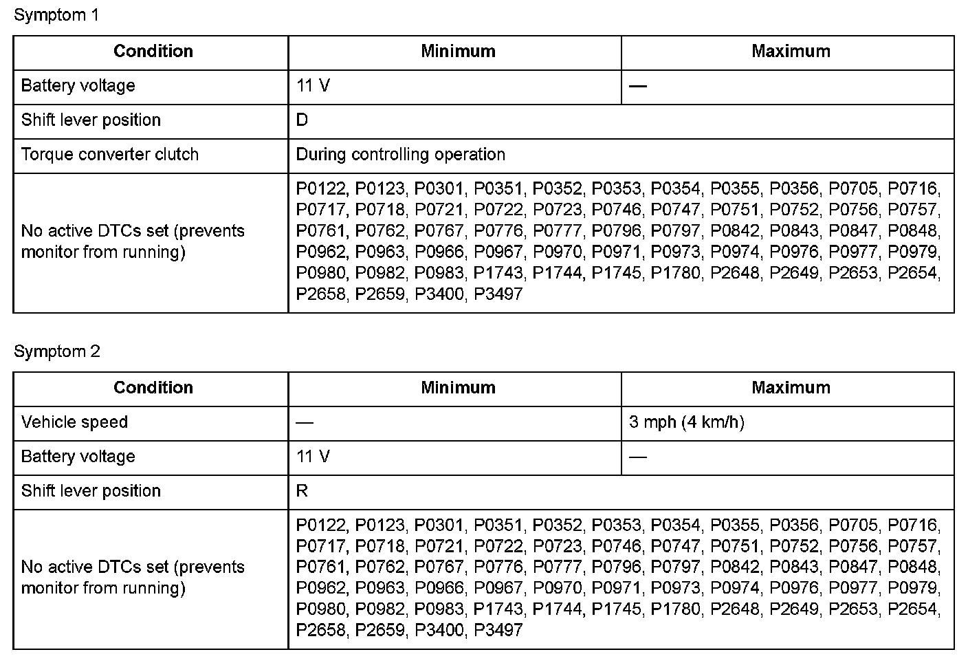Conditions for setting the DTC