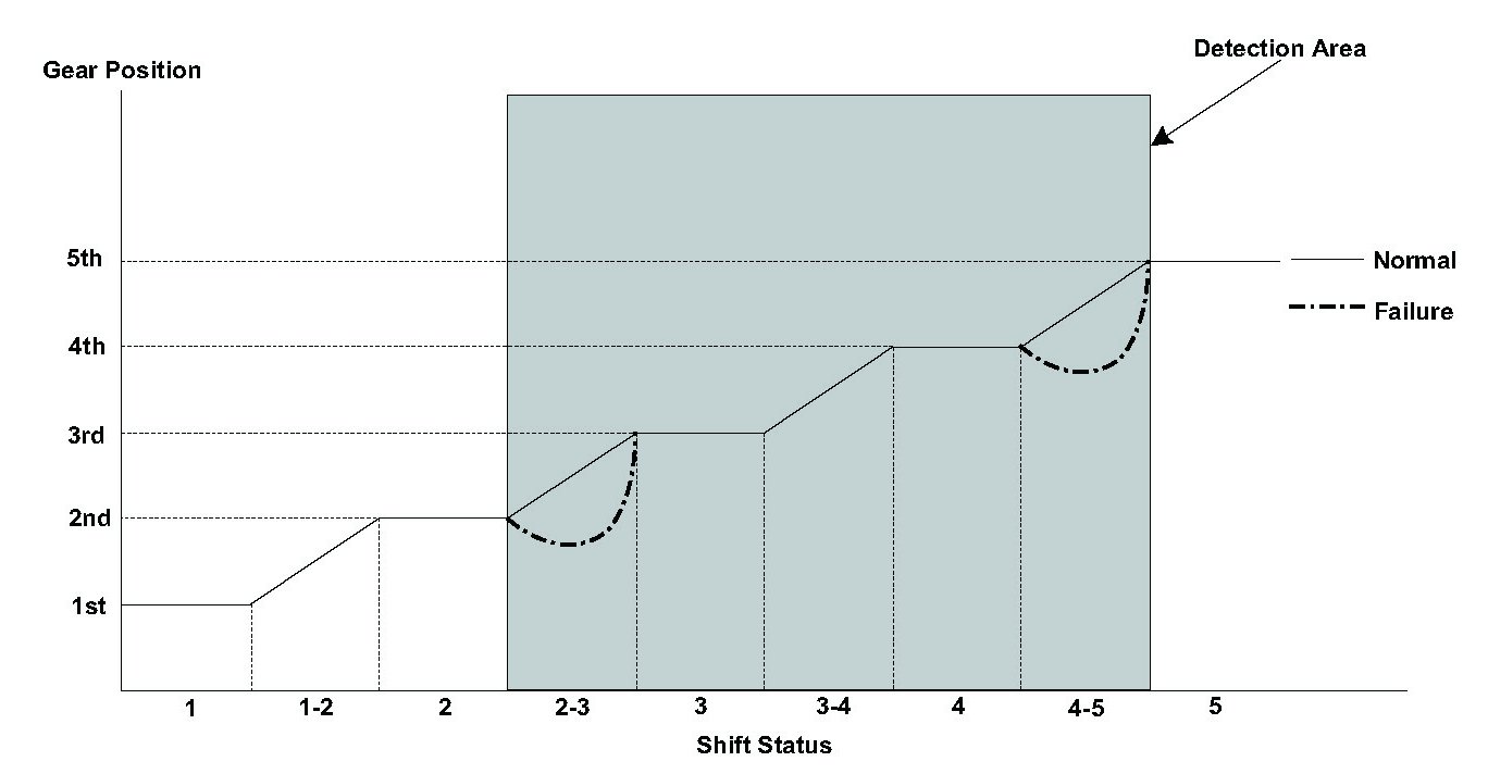 A/T clutch pressure control solenoid valve B is installed in the transmission housing. A/T clutch pressure control solenoid valve B is operated by the powertrain control module (PCM) and converts modulated pressure to A/T clutch pressure control solenoid valve B pressure, which operates CPC valve B. Line pressure is modulated to clutch pressure control B pressure (CPC B pressure) by CPC valve B and the CPC valve B spring. A signal from the PCM is output to the proper gear clutch, determined by the gear schedule, to supply the proper CPC pressure according to the driving conditions. When the current from the PCM is low (OFF), A/T clutch pressure control solenoid valve B operates and the CPC valve B pressure increases. When the current from the PCM is high (ON), A/T clutch pressure control solenoid valve B turns off and the CPC valve B pressure decreases. The PCM monitors the input shaft (mainshaft) speed and the output shaft (countershaft) speed at the gear change determined by the shift schedule. When an improper gear ratio is output compared to the predetermined gear change mode, the PCM detects an A/T clutch pressure control solenoid valve B ON failure and stores a DTC.