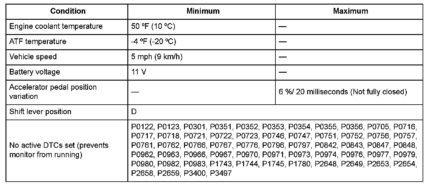 Conditions for setting the DTC