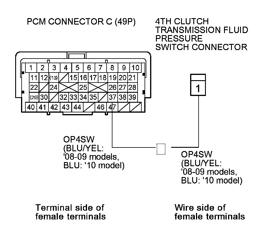 20. Check for continuity between PCM connector terminal C37 and the 4th clutch transmission fluid pressure switch connector terminal.