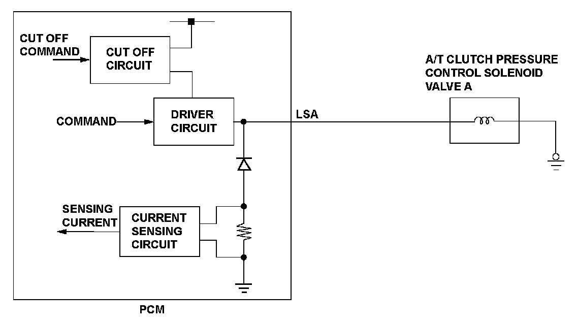 A/T clutch pressure control solenoid valve A is used for clutch pressure control. A spool in A/T clutch pressure control solenoid valve A pushes the valve according to the duty cycle that is controlled by the powertrain control module (PCM) (The hydraulic pressure is proportional to the current). The PCM measures the current flowing through A/T clutch pressure control solenoid valve A, and uses feedback control to compensate for the difference between the actual current and the commanded one. If the measured current for the PCM output duty cycle is not within a specified range (open or short), the PCM detects a malfunction and stores a DTC.