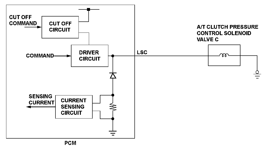 A/T clutch pressure control solenoid valve C is used for clutch pressure control. A spool in A/T clutch pressure control solenoid valve C pushes the valve according to the duty cycle that is controlled by the powertrain control module (PCM) (The hydraulic pressure is proportional to the current). The PCM measures the current flowing through A/T clutch pressure control solenoid valve C, and uses feedback control to compensate for the difference between the actual current and the commanded one. If the measured current for the PCM output duty cycle is not within a specified range (open or short), the PCM detects a malfunction and stores a DTC.