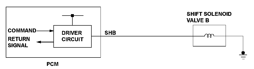When shift solenoid valves A and D are turned ON, or when shift solenoid valves B and C are turned OFF, the hydraulic pressure circuit opens. The hydraulic pressure circuit supplies/discharges hydraulic pressure to/from each clutch according to the combination of the ON/OFF status of the shift solenoid valves. The powertrain control module (PCM) commands the driver circuit to turn on the shift solenoid valve. The circuit diagnoses malfunctions such as a circuit short or open, and sends back a return signal during the PCM's command. When the return signal does not match the PCM command to turn ON the shift solenoid valve, the PCM detects a malfunction and stores a DTC.