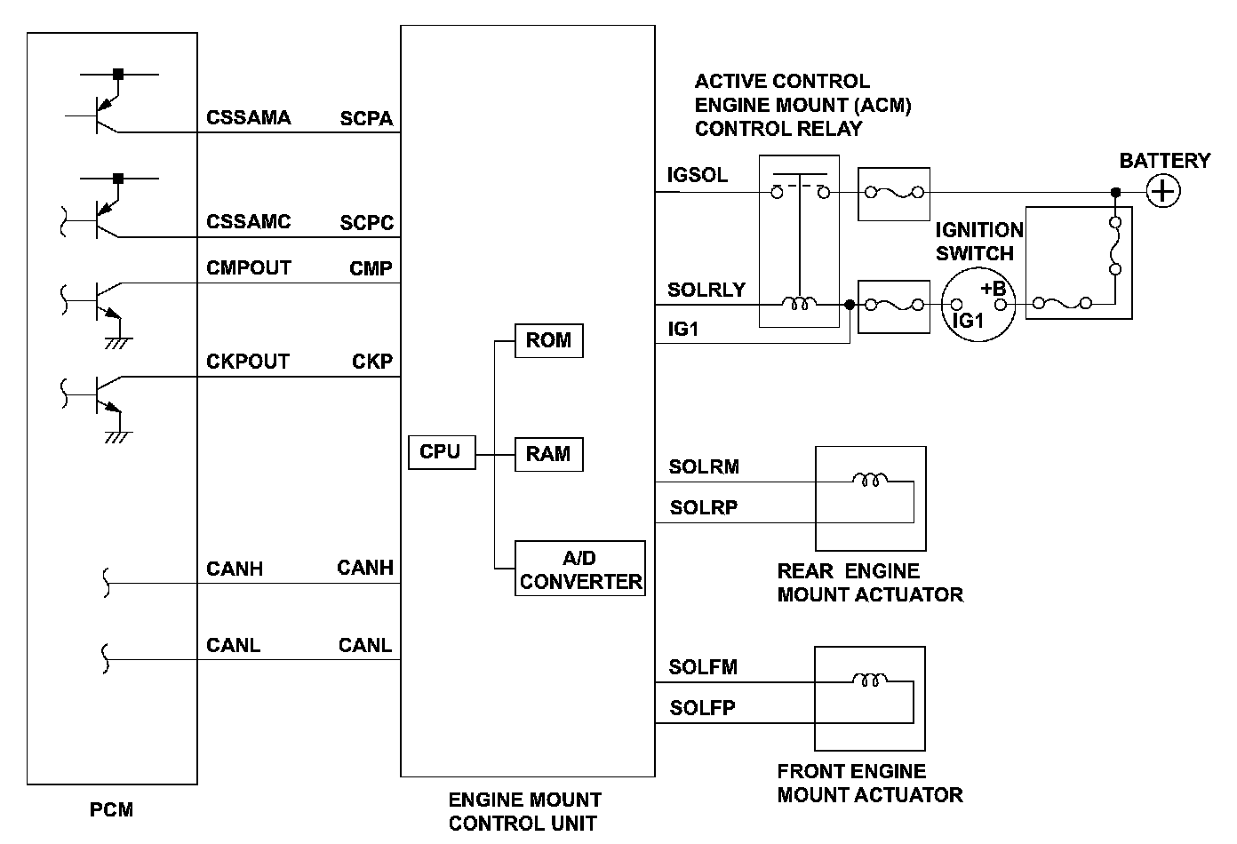 The engine mount control system controls the engine mounts electronically. The system consists of the engine mount actuators, the engine mount control unit, and the powertrain control module (PCM). The engine mount control unit uses the crankshaft and camshaft position sensor outputs (received from the PCM) to estimate engine vibration. The engine mount control unit then sends signals to the engine mount actuator to command the engine mounts to push and pull on the engine to counteract the engine vibration. The engine mount control unit monitors the front engine mount actuator, and when an abnormal condition continues for a set time, the engine mount control unit detects a malfunction and stores a DTC.