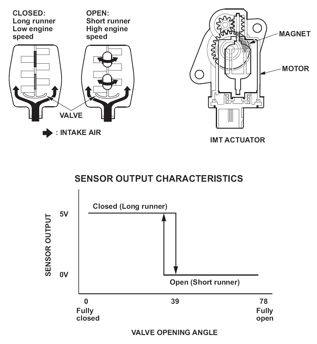 The intake manifold tuning (IMT) system aids engine output by selecting either long or short intake runner lengths. The system consists of the IMT valve, the IMT actuator, and the engine control module (ECM). The IMT actuator is attached to the intake manifold and it includes the motor and the Hall-effect-IC position sensing unit. The ECM actuates the motor, which operates the IMT valve. When the IMT valve is closed, the long runner is selected, increasing torque at low engine speed. When the IMT valve is open, the short runner is selected, increasing torque at high engine speed. A Hall-effect-IC position sensing unit is integrated with the motor to provide precise open/close feedback to the ECM. The IMT actuator sends a long runner return signal to the ECM when the IMT valve is closed, and it sends a short runner return signal when the IMT valve is open. If the ECM receives no closed return signal when it sends a close command, or if it receives no open return signal when sending an open command to the IMT actuator, for a specified time, it detects a malfunction and stores a DTC.