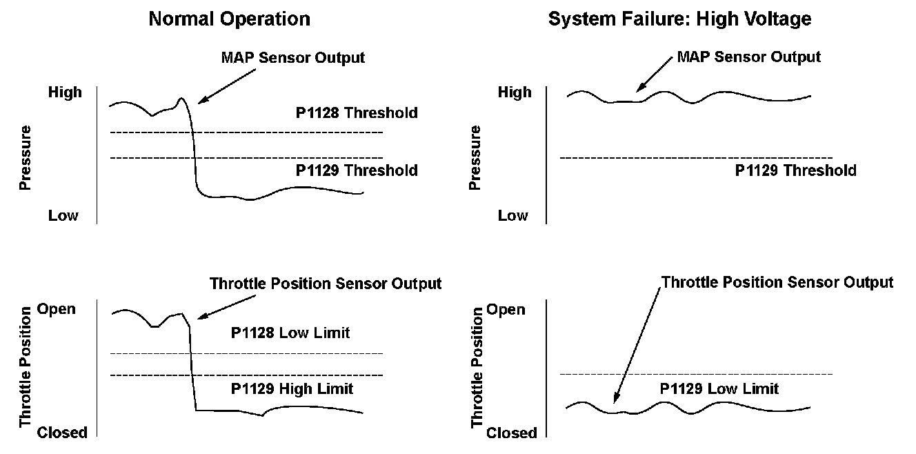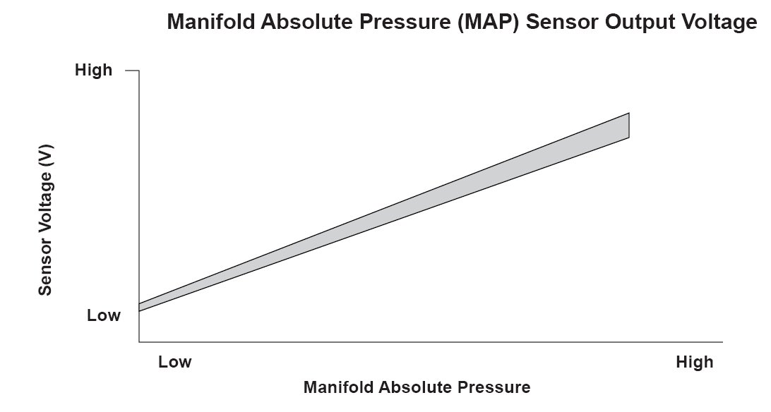 The manifold absolute pressure (MAP) sensor senses manifold absolute pressure (vacuum) and converts it into electrical signals. The MAP sensor outputs low signal voltage at high vacuum (throttle valve closed) and high signal voltage at low vacuum (throttle valve wide open). The engine control module (ECM) compares a predetermined MAP value at a given throttle position and manifold absolute pressure to the output voltage value of the MAP sensor. If the MAP sensor outputs high voltage during fuel cut-off operation for deceleration with the throttle valve fully closed, which should make the manifold absolute pressure lower, the ECM detects a malfunction and stores a DTC.