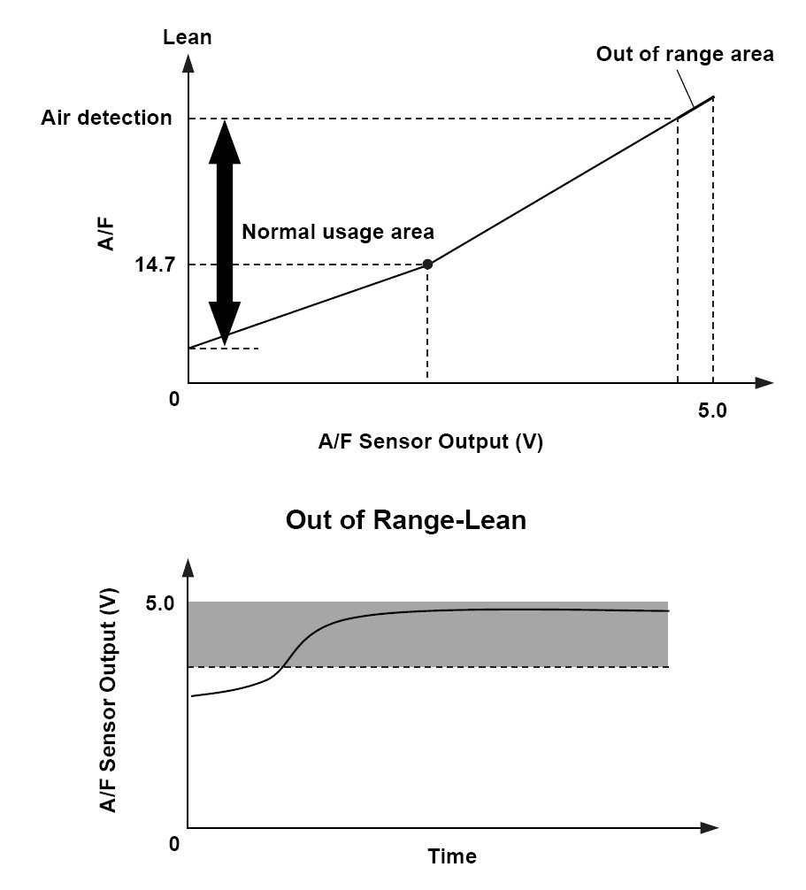 If a malfunction causes the front air/fuel ratio sensor (bank 2, sensor 1) signal to the engine control module (ECM)/powertrain control module (PCM) to deviate from the normal control area, the front air/fuel ratio (A/F) sensor may still become active after the engine starts, but the air/fuel feedback does not start normally and the emissions deteriorate. When the front A/F sensor output is out of the normal area, and this condition continues after the front A/F sensor is active, the ECM/PCM detects a malfunction and stores a DTC.