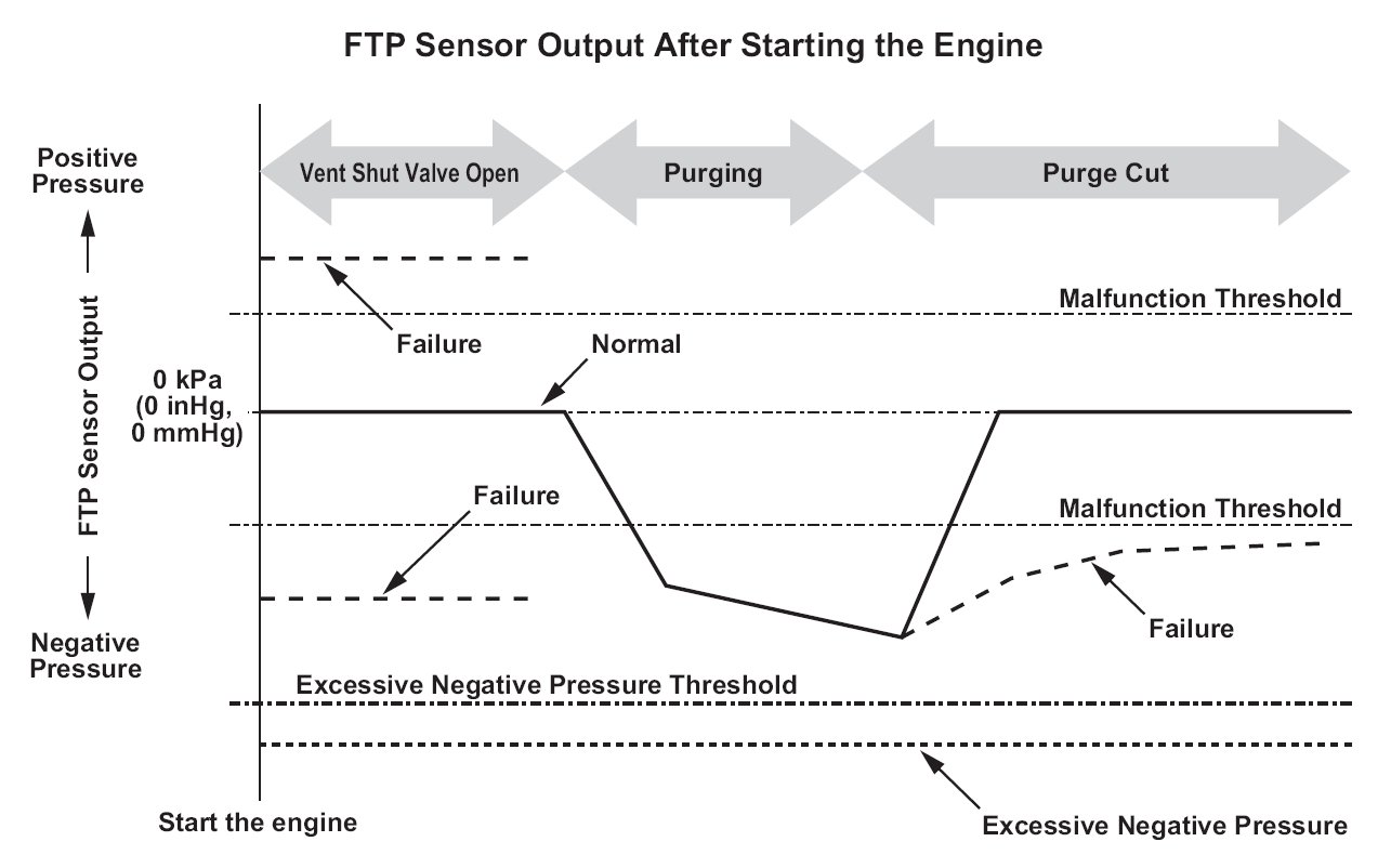 - The FTP sensor output fluctuates by 1.4 kPa (0.4 inHg, 10 mmHg) or more, or -0.7 kPa (-0.2 inHg, -5 mmHg) or less, for at least 10 seconds.