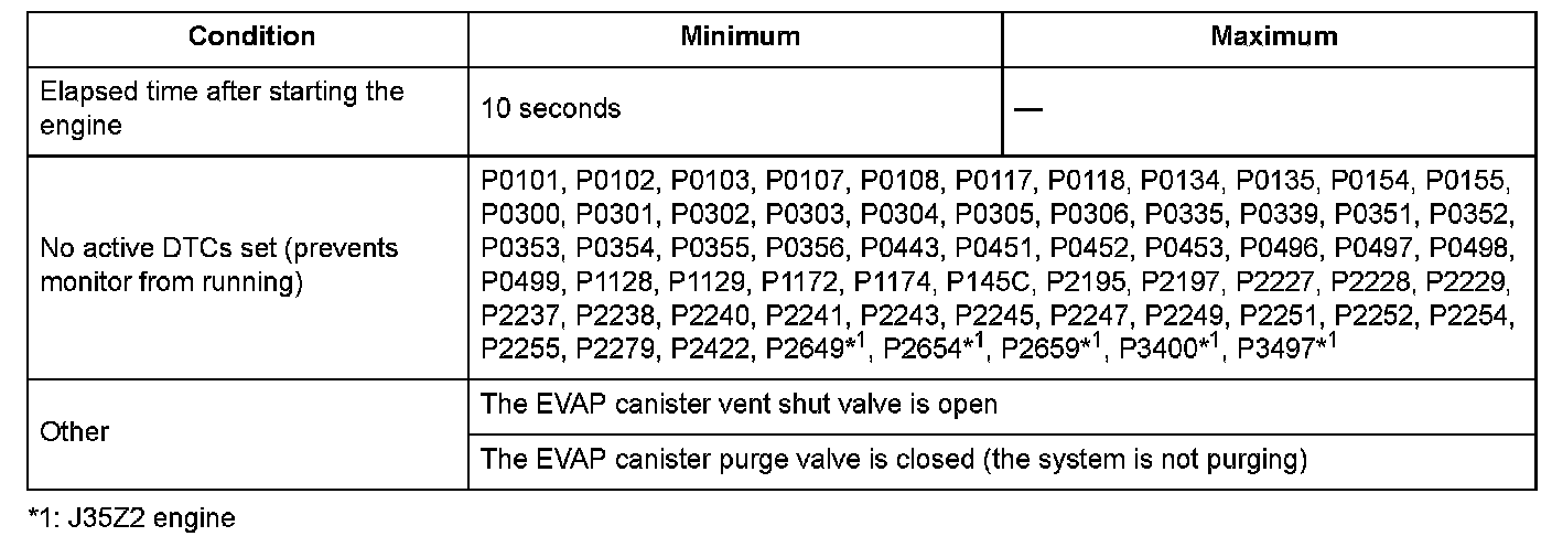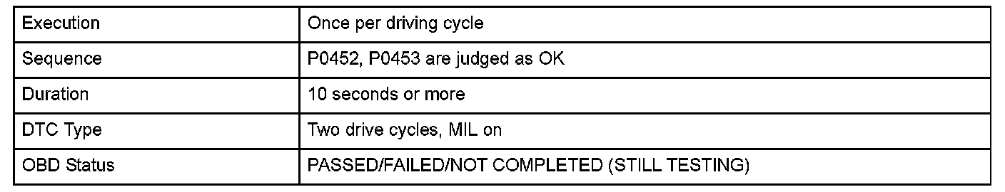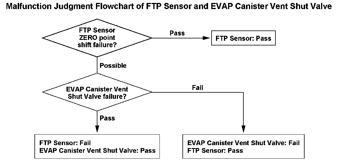 The fuel tank pressure is about 0 kPa (0 inHg, 0 mmHg) when starting a cold engine. When the fuel tank pressure (FTP) sensor output value is out of a specified range and the engine control module (ECM)/powertrain control module (PCM) judges that there's no other cause [no evaporative emission (EVAP) canister vent shut valve failure, etc.] for the FTP sensor zero point shift, the ECM/PCM detects an FTP sensor malfunction. However, if the FTP sensor output when starting the engine, is a prescribed negative value or less (excessive negative pressure is detected), the malfunction judgment should be done as follows because it is difficult to distinguish the FTP sensor zero point shift (P1454) from the EVAP canister vent shut valve failure (P2422).