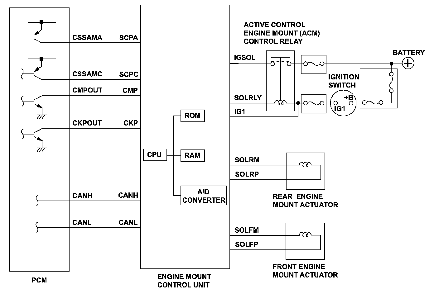 The engine mount control system controls the engine mounts electronically. The system consists of the engine mount actuators, the engine mount control unit, and the powertrain control module (PCM). The engine mount control unit uses the crankshaft and camshaft position sensor outputs (received from the PCM) to estimate engine vibration. The engine mount control unit then sends signals to the engine mount actuators to command the engine mounts to push and pull on the engine to counteract the engine vibration. The engine mount control unit monitors the SCPC signal. If the SCPC signal input value differs from the PCM output value (received by CAN communication) for a set time, the engine mount control unit detects a malfunction and stores a DTC.