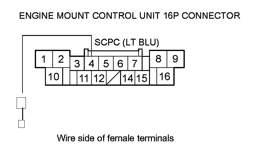 Repair open in the wire between engine mount control unit 16P connector terminal No. 4 and PCM connector terminal A15, then go to step 16.