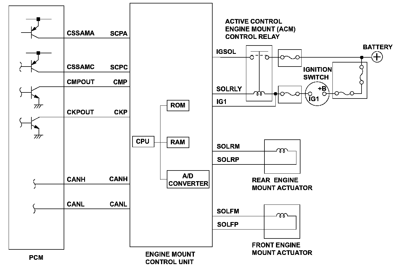 The engine mount control system controls the engine mounts electronically. The system consists of the engine mount actuators, the engine mount control unit, and the powertrain control module (PCM). The engine mount control unit uses the crankshaft and camshaft position sensor outputs (received from the PCM) to estimate engine vibration. The engine mount control unit then sends signals to the engine mount actuators to command the engine mounts to push and pull on the engine to counteract the engine vibration. The engine mount control unit monitors the CMP signal input to the engine mount control unit. If the CMP signal is not input to the engine mount control unit for a set time, the engine mount control unit detects a malfunction and stores a DTC.