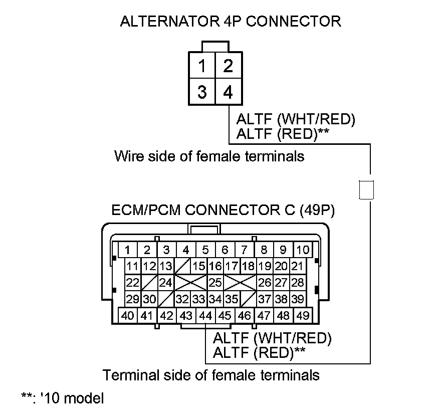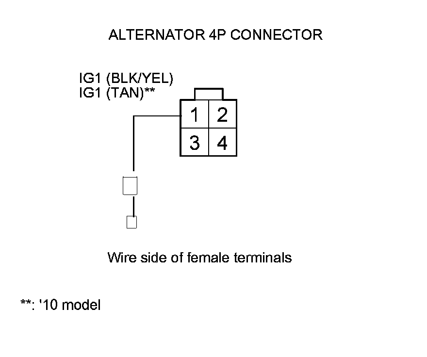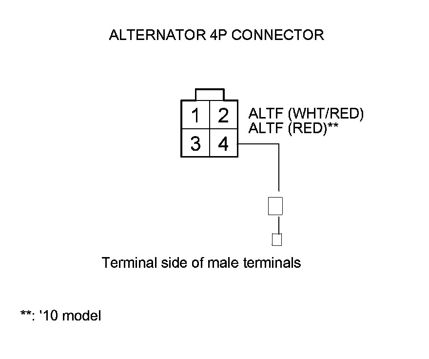 1. Check for poor connections or loose terminals at the alternator 4P connector.