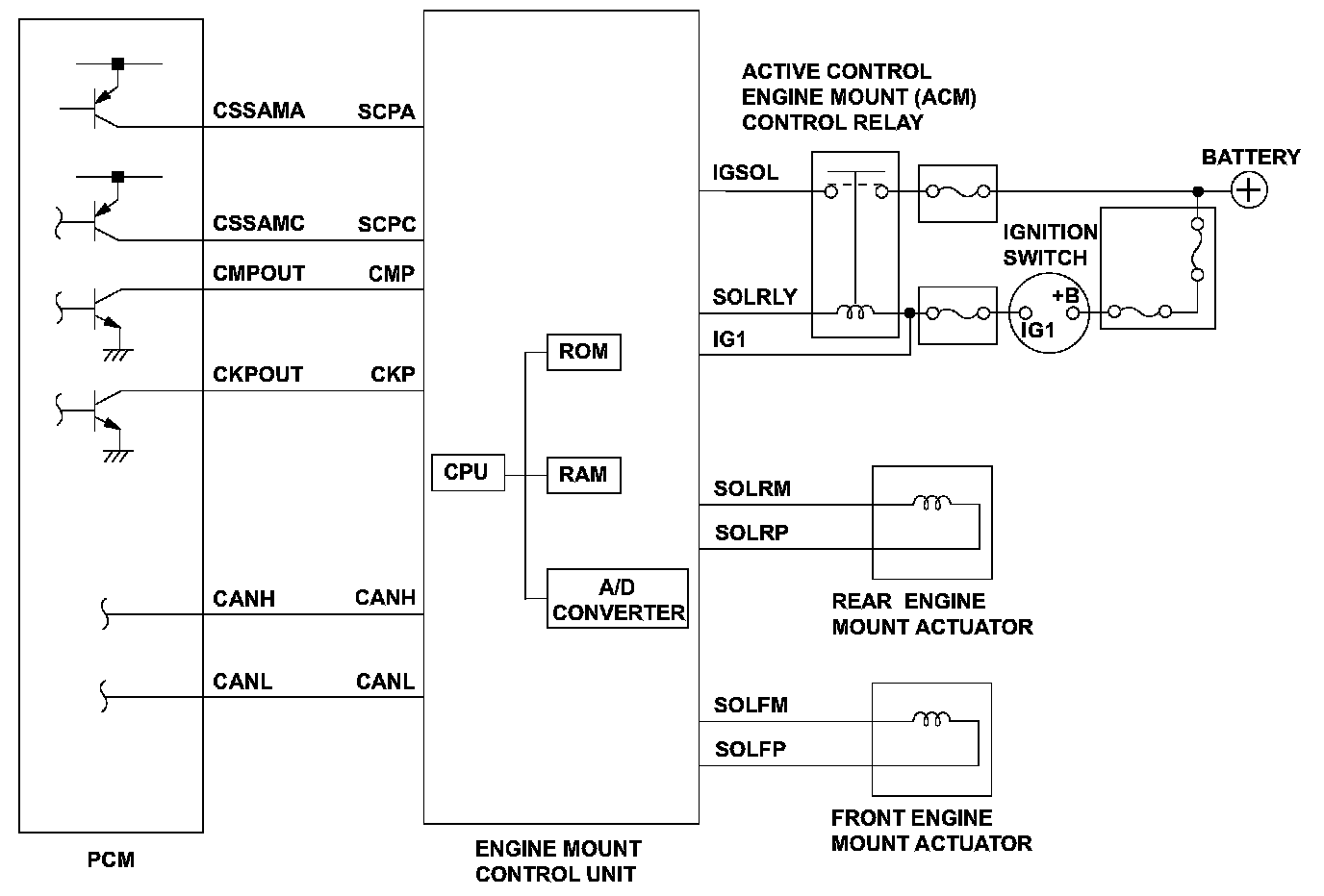 The engine mount control system controls the engine mounts electronically. The system consists of the engine mount actuators, the engine mount control unit, and the powertrain control module (PCM). The engine mount control unit uses the crankshaft and camshaft position sensor outputs (received from the PCM) to estimate engine vibration. The engine mount control unit then sends signals to the engine mount actuators to command the engine mounts to push and pull on the engine to counteract the engine vibration. The engine mount control unit monitors the engine mount control unit power voltage. If the IGSOL voltage is set value for a set time, the engine mount control unit detects a malfunction and stores a DTC.