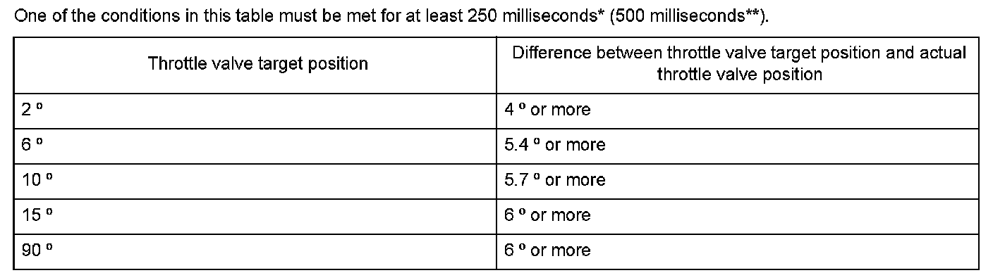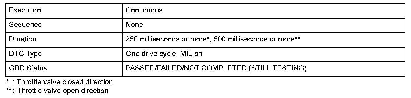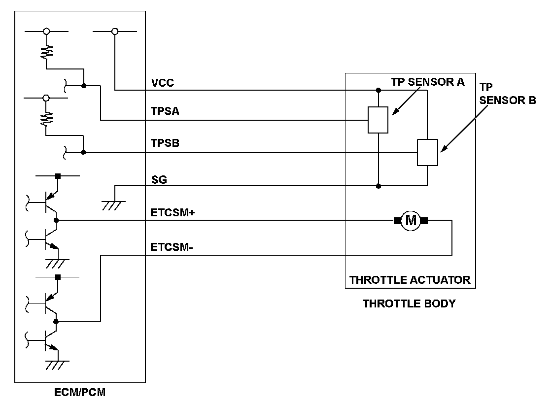 The electronic throttle control system controls the throttle valve opening. The system includes the throttle actuator, the throttle valve, throttle position (TP) sensors A and B, the electronic throttle control system (ETCS) control relay, the accelerator pedal position (APP) sensor, and the engine control module (ECM)/powertrain control module (PCM). When the accelerator pedal is pressed, the APP sensor detects the accelerator opening value. The accelerator pedal opening value is converted to a signal in the APP sensor and transmitted to the ECM/PCM to compute the target position. The ECM/PCM determines the throttle valve target position according to the signal received and operates the throttle actuator to move the throttle valve to the target position. The actual throttle valve position is determined by TP sensor A (installed in the throttle body). The ECM/PCM compares the throttle valve target opening angle and the actual throttle valve opening angle from TP sensor A, and when the difference exceeds the specification, the ECM/PCM detects the malfunction of the electronic throttle control system and stores a DTC.
