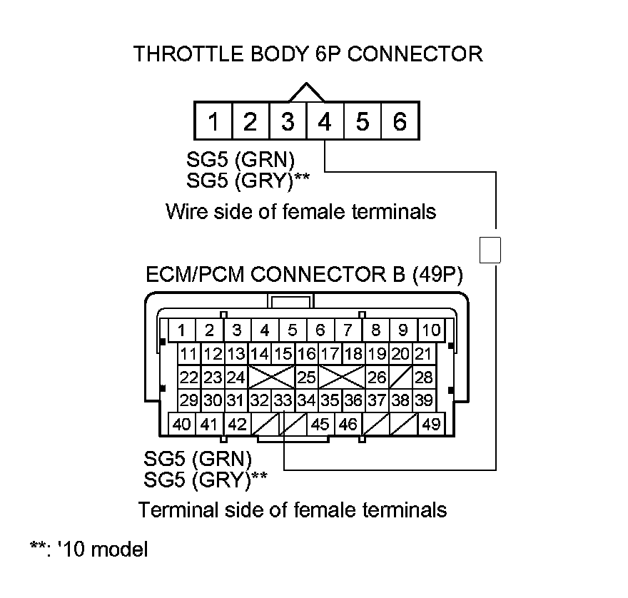 9. Check for continuity between ECM/PCM connector terminal B33 and throttle body 6P connector terminal No. 4.